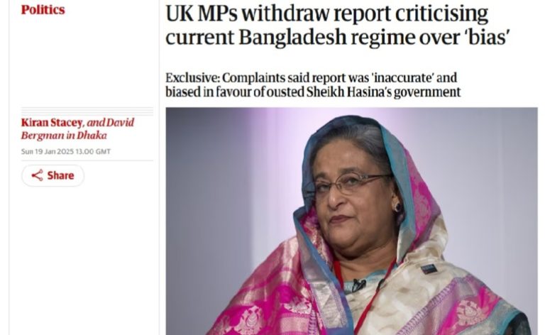 বাংলাদেশের অন্তর্বর্তীকালীন সরকারের সমালোচনা করে যুক্তরাজ্যের সংসদ সদস্যদের দেওয়া একটি বিতর্কিত প্রতিবেদন প্রত্যাহার করা হয়েছে। অভিযোগ ওঠে যে, প্রতিবেদনটি ক্ষমতাচ্যুত প্রধানমন্ত্রী শেখ হাসিনার সরকারের প্রতি পক্ষপাতদুষ্ট। এই ঘটনার পর রোববার (১৯ জানুয়ারি) ব্রিটিশ সংবাদমাধ্যম দ্য গার্ডিয়ান এ প্রতিবেদনটি প্রত্যাহারের খবর প্রকাশ করে।