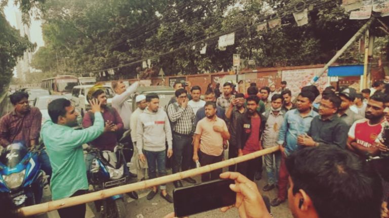 বাঁশ দিয়ে তিতুমীর কলেজের সামনের রাস্তা অবরোধ করলেন শিক্ষার্থীরা