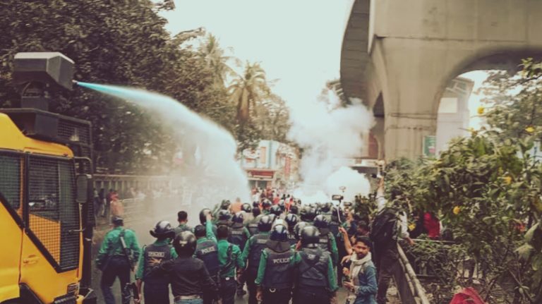 এ সময় আন্দোলনকারীদের লক্ষ্য করে পুলিশ জলকামান থেকে পানি ছোড়ে এবং পরে পাঁচ রাউন্ড সাউন্ড গ্রেনেড নিক্ষেপ করে।