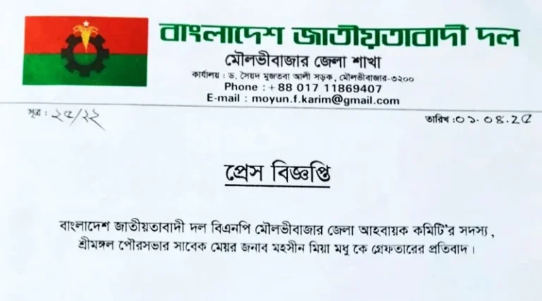 ফয়জুল কমির ময়ূন স্বাক্ষরিত প্রেসবিজ্ঞপ্তিতে উল্লেখ করেছেন, বাংলাদেশ জাতীয়তাবাদী দল জেলা বিএনপি’র আহ্বায়ক কমিটির সদস্য, শ্রীমঙ্গল উপজেলা বিএনপির সাবেক সভাপতি এবং সাবেক ৪ বারের নির্বাচিত জননন্দিত মেয়র মহসিন মিয়া মধুকে গ্রেফতারের প্রতিবাদ জানাই। মহসিন মিয়া মধু বিজ্ঞ রাজনীতিবিদ ও বিশিষ্ট সমাজ সেবক পুরোপকারী, তিনি দেশ ও সমাজ বিনির্মাণে কাজ করে চলেছেন। আমি অবিলম্বে তার মুক্তির দাবি জানাই।