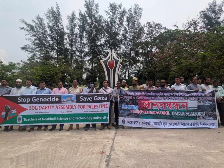 নোবিপ্রবি প্রতিনিধি: বিশ্ব সন্ত্রাসী ইহুদীবাদী ইসরাইল গাজা ও ফিলিস্তিনে বর্বরতম গণহত্যা ও সন্ত্রাসী আগ্রাসনের প্রতিবাদে ও ফিলিস্তিনে আগ্রাসন বন্ধের দাবিতে নোয়াখালী বিজ্ঞান ও প্রযুক্তি বিশ্ববিদ্যালয়ের (নোবিপ্রবি) শিক্ষক- কর্মকর্তা-কর্মচারীবৃন্দ মানববন্ধন করেন।