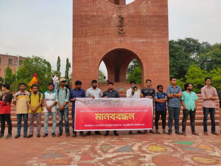 জাবি প্রতিনিধি: খুলনা বিজ্ঞান ও প্রযুক্তি বিশ্ববিদ্যালয়ে (কুয়েট) চলমান আন্দোলনের প্রতি সংহতি জানিয়ে এবং অবিলম্বে কুয়েট উপাচার্যের পদত্যাগ দাবিতে জাহাঙ্গীরনগর বিশ্ববিদ্যালয়ে (জাবি) মানববন্ধন কর্মসূচি পালিত হয়েছে। মঙ্গলবার (২২ এপ্রিল) বিকেলে বিশ্ববিদ্যালয়ের কেন্দ্রীয় শহীদ মিনারের পাদদেশে বাংলাদেশ গণতান্ত্রিক ছাত্রসংসদ জাবি শাখার আয়োজনে এ মানববন্ধন কর্মসূচি পালিত হয়।