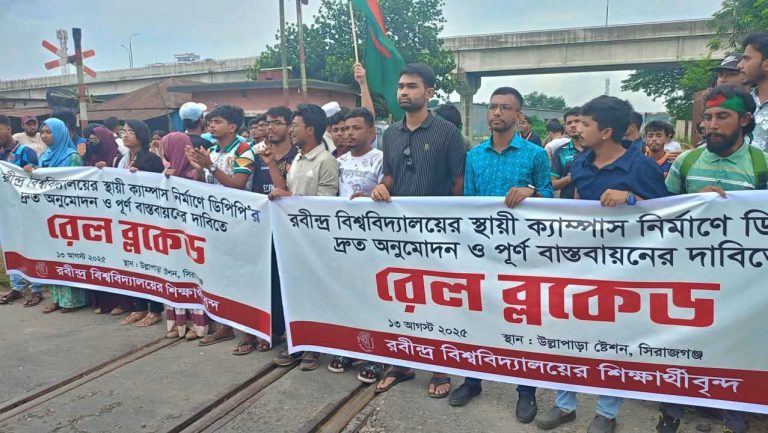 সিরাজগঞ্জ জেলা প্রতিনিধিঃ রবীন্দ্র বিশ্ববিদ্যালয়ের স্থায়ী ক্যাম্পাস নির্মাণে উন্নয়ন প্রকল্প প্রস্তাবনা (ডিপিপি) দ্রুত অনুমোদন ও পূর্ণ বাস্তবায়নের দাবিতে রেল ব্লকেড কর্মসূচি পালন করেছে শিক্ষার্থীরা। ফলে ঢাকা-রাজশাহী ট্রেন যোগাযোগ বন্ধ রয়েছে।