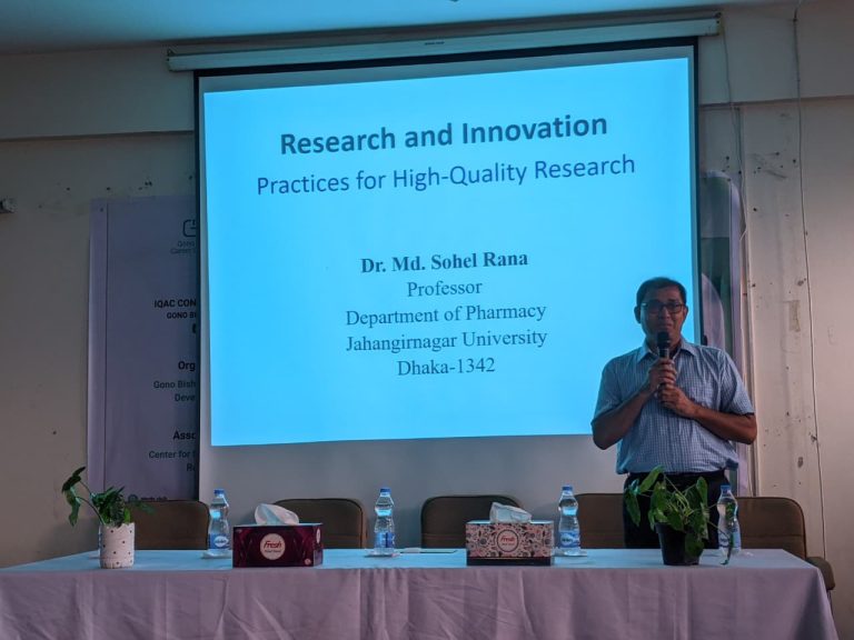 গবেষণার গুরুত্ব তুলে ধরে প্রধান অতিথি জাহাঙ্গীরনগর বিশ্ববিদ্যালয়ের ফার্মেসি বিভাগের অধ্যাপক ড. মো. সোহেল রানা বলেন, ‘গবেষণা শুধু তথ্য সংগ্রহ নয়; এটি সমস্যা চিহ্নিত করা, হাইপোথেসিস তৈরি ও যাচাই করে নতুন জ্ঞান সৃষ্টি করার একটি প্রক্রিয়া। গাইডলাইন রিসার্চের মাধ্যমে সিস্টেমেটিকভাবে তদন্ত চালিয়ে বিদ্যমান তথ্য থেকে নতুন জ্ঞান তৈরি করা যায়, যা বাস্তব সমস্যার সমাধানেও সহায়ক। তিনি আরও উল্লেখ করেন, স্পষ্টভাবে সমস্যা নির্ধারণ করা জরুরি। থিওরিটিক্যাল থেকে প্র্যাকটিক্যাল পর্যায়ে গবেষণার গুরুত্ব তুলে ধরে তিনি নিজের অভিজ্ঞতা শেয়ার করেন এবং শিক্ষার্থীদের গবেষণায় উৎসাহিত করেন।’