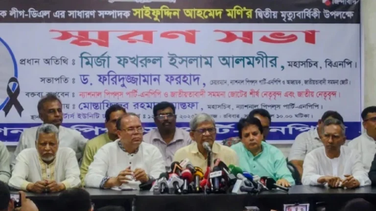 ন্যাশনাল পিপলস পার্টির চেয়ারম্যান ফরিদুজ্জামান ফরহাদের সভাপতিত্বে ও মহাসচিব মোস্তাফিজুর রহমান মোস্তফার সঞ্চালনায় আলোচনা সভায় জাগপার খন্দকার লুফুর রহমান, গণদলের এটিএম গোলাম মাওলা চৌধুরী, সাম্যবাদী সৈয়দ নুরুল ইসলাম, বাংলাদেশ ন্যাপের এমএন শাওন সাদিকী প্রমূখ বক্তব্য রাখেন।