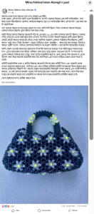 স্ট্যাটাসে তিনি জানান, ঢাকা জেলে থাকার সময় তার কন্যা একবার তাকে দেখতে এলে তিনি ওইকে একটি ব্যাগ উপহার দিয়েছিলেন — ব্যাগটি জেলের ভেতের এক বন্দি তৈরি করে দিয়েছিল; হয়তো কল্পনাও করে বানিয়েছিল। তিনি বলেন, গত পনেরো বছরে দেশের কারাগারে লাখ লাখ কর্মী মিথ্যা মামলায় আটক ছিলেন, আর তাঁর নিজের এলাকার শতশত তরুণের জীবন জেলে শেষ হয়ে গেছে।