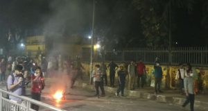 পৌনে ছয়টার দিকে আন্দোলনকারীরা আবারও জড়ো হয়ে ধাওয়া দেওয়ার চেষ্টা করে। তারা পুলিশের দিকে ইট-পাটকেল ছুড়ে মারছে। টিএসসি থেকে এসে শিল্পাচার্য জয়নুল ভবনের সামনে তারা রাস্তায় আগুন জ্বালিয়ে বিক্ষোভ দেখাচ্ছে। এ সময় মোবাশ্বেরের বিরুদ্ধে অশালীন স্লোগানও দেয়া হচ্ছে।