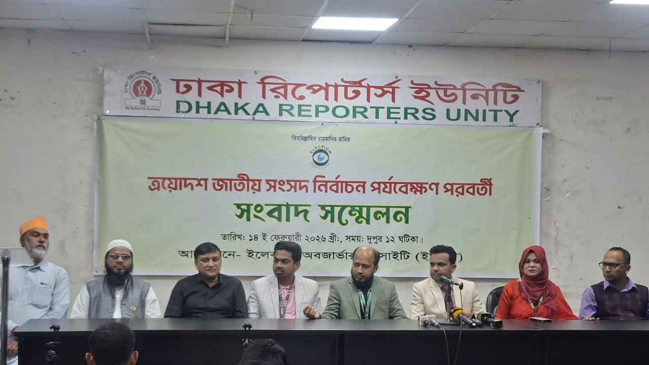 শনিবার (১৪ ফেব্রুয়ারি) দুপুরে রাজধানীর ঢাকা রিপোর্টার্স ইউনিটিতে (ডিআরইউ) ‘ত্রয়োদশ জাতীয় সংসদ নির্বাচন: পর্যবেক্ষকদের তাৎক্ষণিক রিপোর্ট ও সংক্ষিপ্ত বিশ্লেষণ’ অনুষ্ঠানে এসব মন্তব্য করেছে নির্বাচনের পর্যবেক্ষক সংস্থা ইলেকশন অবজার্ভার সোসাইটি (ইওএস)।