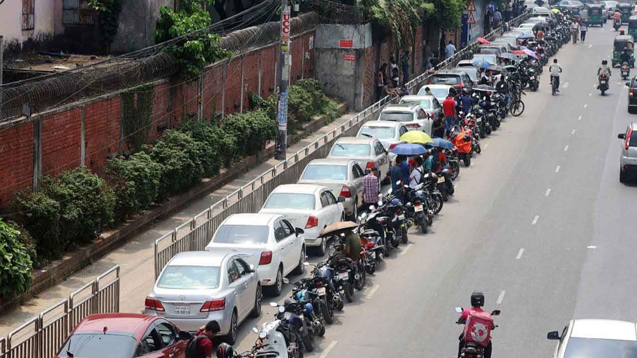 শনিবার (১৮ এপ্রিল) দুপুরে রাজধানীর মেরুল বাড্ডা থেকে শাহজাহানপুর পর্যন্ত সড়কের দুই পাশে পেট্রোল পাম্পকেন্দ্রিক দীর্ঘ যানবাহনের সারি দেখা গেছে। এসব সারিতে ব্যক্তিগত গাড়ি, বাস, ট্রাক ও মোটরসাইকেলের উপস্থিতি ছিল বেশি। তেল সংগ্রহের অপেক্ষায় যানবাহনগুলো দীর্ঘ সময় দাঁড়িয়ে থাকায় পুরো সড়কজুড়ে ধীরগতির যানচলাচল এবং কোথাও কোথাও স্থবির পরিস্থিতির সৃষ্টি হয়।