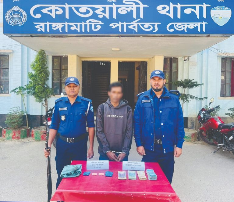 রাঙামাটি কোতয়ালী থানা পুলিশের বিশেষ অভিযানে গতকাল ৫০০ পিস ইয়াবা ট্যাবলেট (মাদকদ্রব্য) ও মাদক বিক্রয়ের ৫৬,৫০০/-টাকা উদ্ধারসহ ১ জন অভিযুক্তকে গ্রেফতার করা হয়। জানা যায়, গতকাল বৃহস্পতিবার রাঙ্গামাটি পার্বত্য জেলার কোতয়ালী থানাধীন ০১ নং পৌর ওয়ার্ডস্থ মহসিন কলোনী এলাকায় মাদক কেনাবেচা হয় মর্মে গোপন সংবাদ পাওয়া যায়। উক্ত সংবাদ প্রাপ্তির সাথে সাথেই রাঙ্গামাটি পার্বত্য জেলার পুলিশ সুপার ড. এস এম ফরহাদ হোসেন মহোদয়ের দিকনির্দেশনায় কোতয়ালী থানার অফিসার ইনচার্জ মোহাম্মদ সাহেদ উদ্দিনের তত্ত্বাবধানে উক্ত এলাকায় বিশেষ অভিযান পরিচালনা করেন রাত্রিকালীন কিলো-০১ ডিউটিতে নিয়োজিত এসআই (নিঃ) মোঃ শফিকুল ইসলাম ও অন্যান্য সঙ্গীয় ফোর্স।